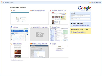 Seveda sem napeto čakal, kaj bo. Še pred uradno predstavitvijo se je vedelo kar nekaj podrobnosti. Zadeva bo imela enako drobovje prikazovanja HTML kot Applov Safari in Konqueror. Zadeva bo vsako stran posebej razumela kot aplikacijo. Chrome bo popolnoma prilagojen spletu 2.0. Razumljivo, da sem bil precej navdušen, ko sem dobil priložnost, da ga prenesem.